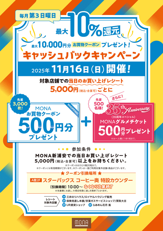 当日のお買上げ最大10%還元キャンペーン!|イベント&ニュース|MONA新浦安 | 新浦安駅直結のショッピングセンター