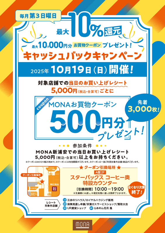 対象店舗での当日のお買上げレシート合計5,000円(税込・合算可)ごとにMONAお買い物クーポン500円分プレゼント!