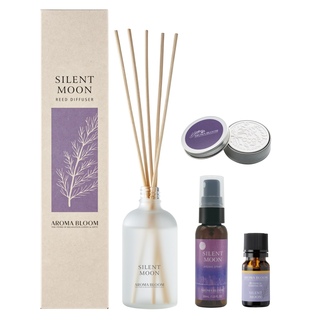 サイレントムーンはアロマブルームで最も人気のあるブレンドの香り(ラベンダー、ベルガモッド、ヒノキ、オレンジ、クラリセージ精油配合)まるで森に包まれているかのようなやわららかく落ち着いた香りです。