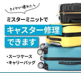 ミスターミニットではスーツケース・キャリーケースのキャスター(車輪)交換を実施しております! 詳しくはスタッフまでお気軽にお問い合わせください!