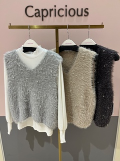 キラキラシャギーニットベスト。 パールも散りばめられていて華やかな印象です。クリスマスやお正月の集まりにもゴージャスでピッタリですね! ナイロン75% レーヨン15% アクリル10% 手洗い可