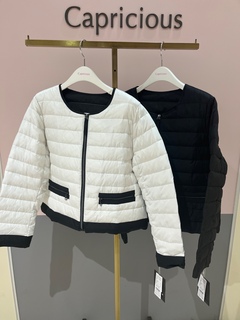ノーカラージャケットのデザインのダウン。キレイ目にもコーディネートできますね。 オフ白、ブラック ダウン80% フェザー20%