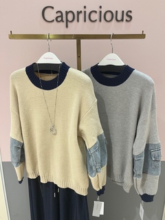 20%オフ!! 袖のデニム切替がオシャレなニットプルオーバー。ボトムにデニムだとピッタリですね〜! チクチクしないのでそのまま着てもOK! オフ、グレー 手洗い可