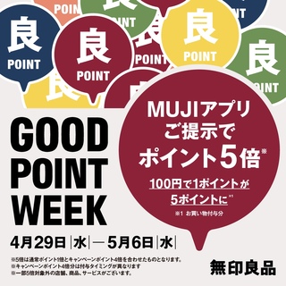 無印良品メンバー様にMUJI GOOD PROGRAMのポイントをお買い物やお店のチャックイン、ReMuji回収他、様々な内容で5倍になるキャンペーンです。 ぜひこの機会にご利用くださいませ。