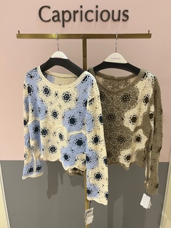 モチーフつなぎがステキなニット。コンパクトサイズなのでスッキリ着こなせます。インにタートルやチュールを重ねるとオシャレ感アップ! ブルー、モカ茶 手洗い可 綿100%