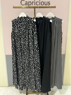 毎年大人気のポリエステルワンピース入荷しました!なんと言ってもシワにならずお手入れ簡単なのがいいですよね。前開きなのでジレ風にパンツに合わせてもステキです。 ダルメシアン柄、千鳥格子、ブラック