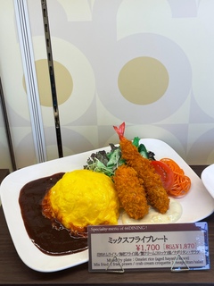 ボリューム満点なミックスフライプレートです! (花咲オムライス、海老フライ1尾、蟹クリームコロッケ、ナポリタン、サラダ)